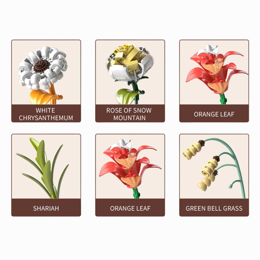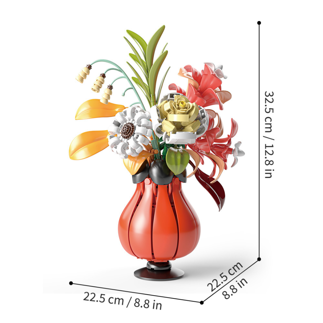 Zestaw zawiera 382 elementy, z których powstaje kompozycja kwiatów w ozdobnym wazonie w kolorze czerwonym. Po złożeniu model osiąga wymiary ok. 32,5 × 22,5 cm, dzięki czemu idealnie nadaje się do ustawienia na stole, półce czy biurku. Bukiet zawiera różnorodne gatunki kwiatów, takie jak róże, lilie i dekoracyjne liście, tworząc harmonijną całość. Klocki wykonano z wysokiej jakości plastiku, bezpiecznego dla dzieci, a konstrukcja jest w pełni kompatybilna z LEGO. To świetna alternatywa dla zestawów LEGO Botanical Collection, w niższej cenie, ale z równie pięknym efektem końcowym.